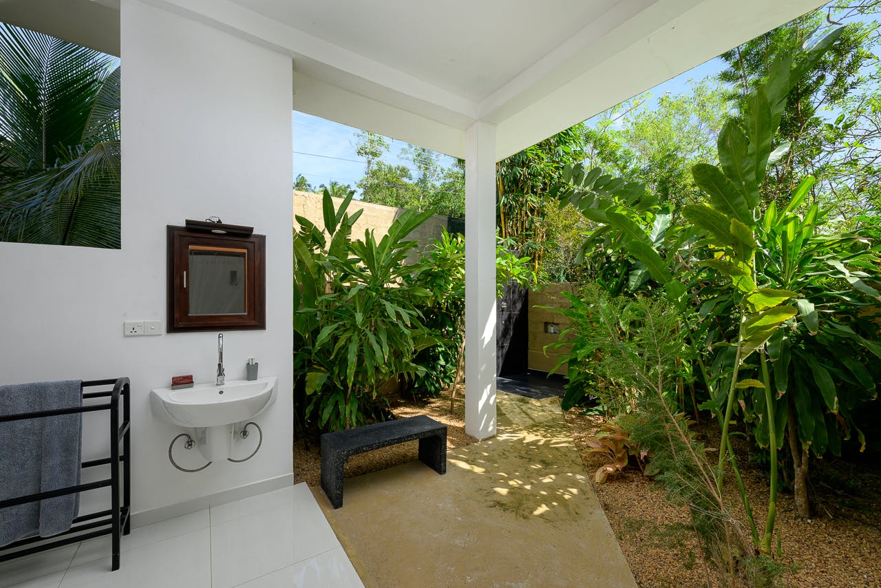 Dieses Doppelbett Zimmer verfügt über ein außergewöhnliches Outdoor-Badezimmer, ein komfortables King-Size-Bett und eine private Terrasse. Für Paare, und Einzeln Reisende, die Romantik, Ruhe, Natur und stilvollen Komfort mit Blick in einen wunderschönen Garten suchen.