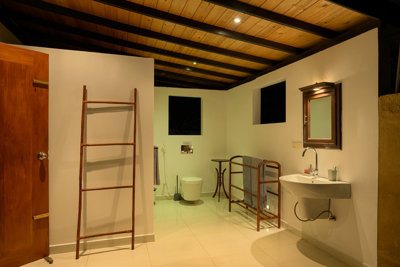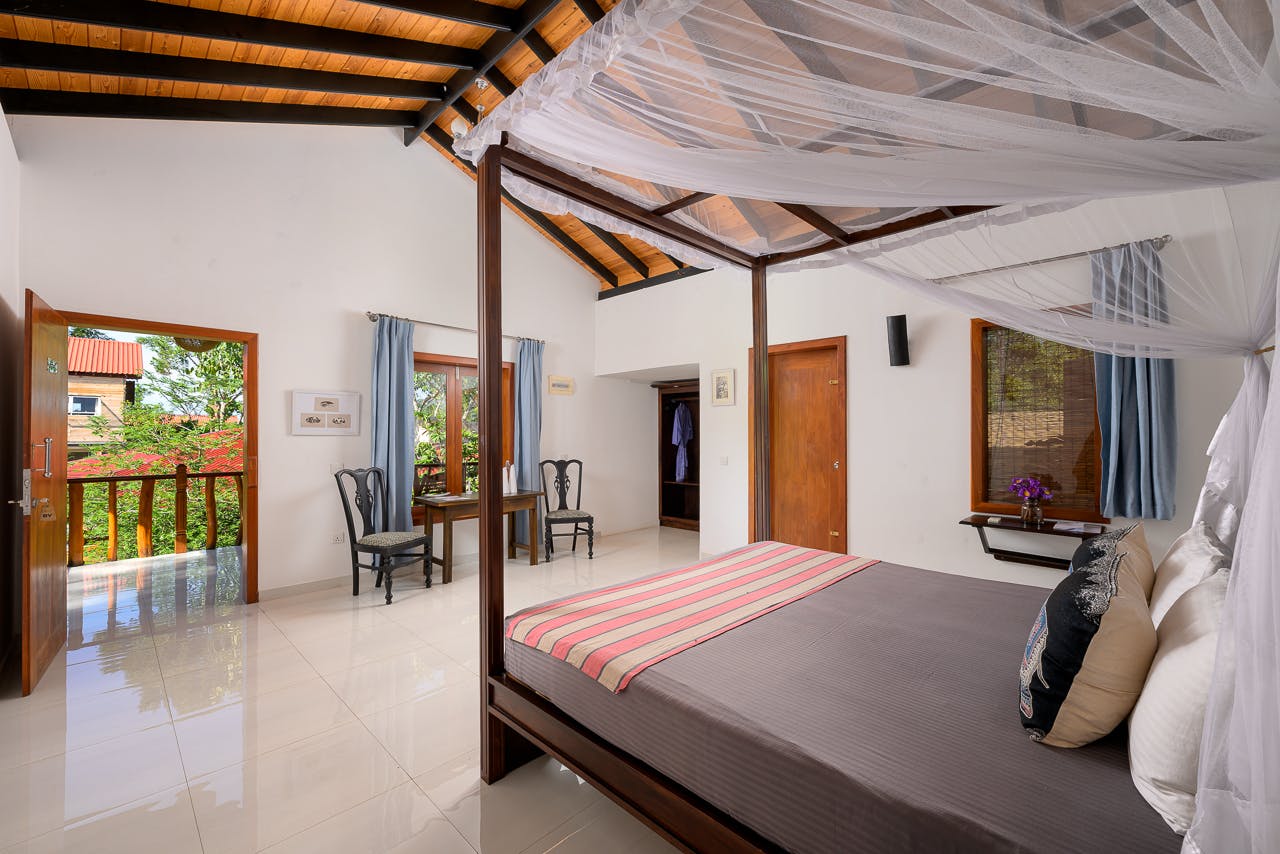 Das Bougainvillea Deluxe Doppelzimmer liegt im ersten Obergeschoss und bietet ein außergewöhnliches Outdoor-Bad, ein komfortables King-Size-Bett, eine große Terrasse mit Gartenblick und ein stilvolles Ambiente. Perfekt für Paare, und Allein Reisende, die Romantik, Komfort und Natur genießen möchten.